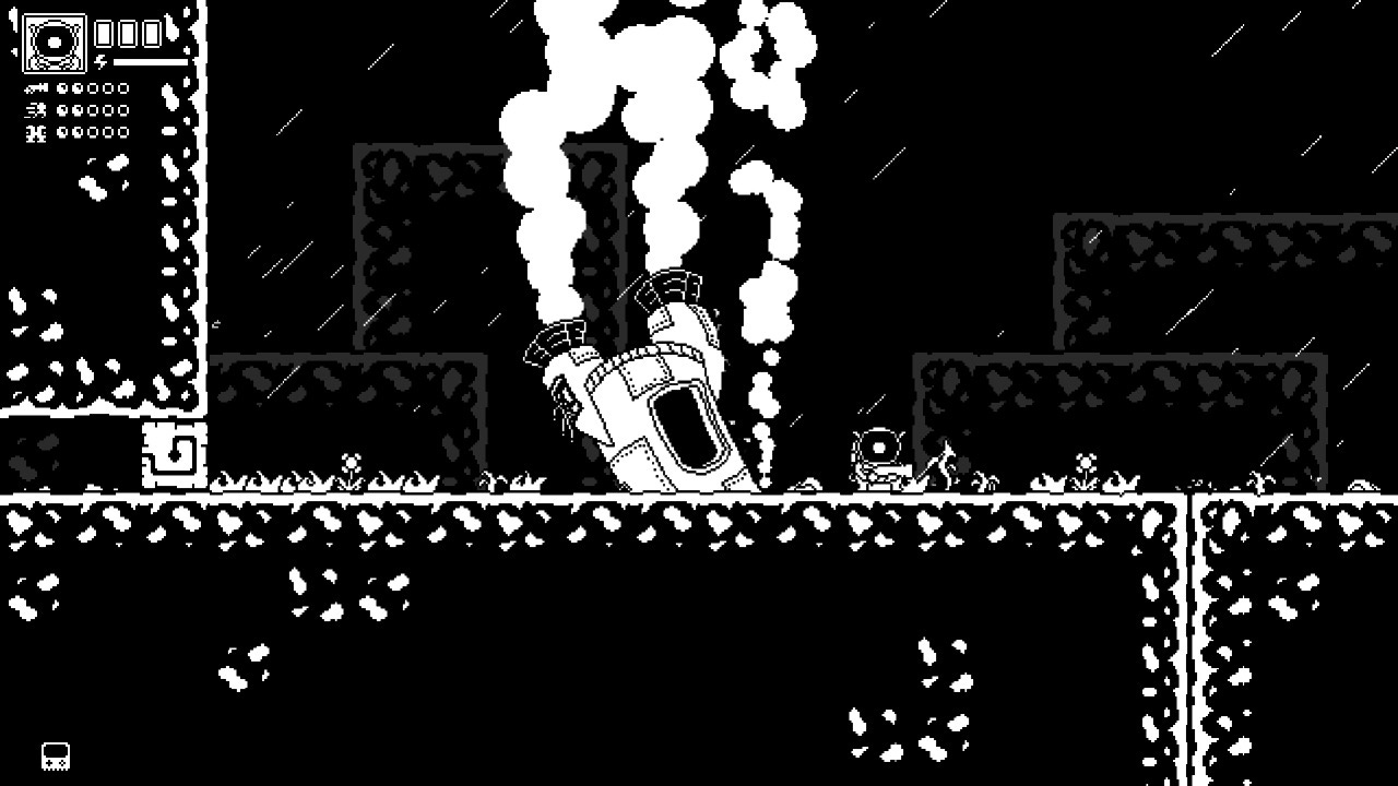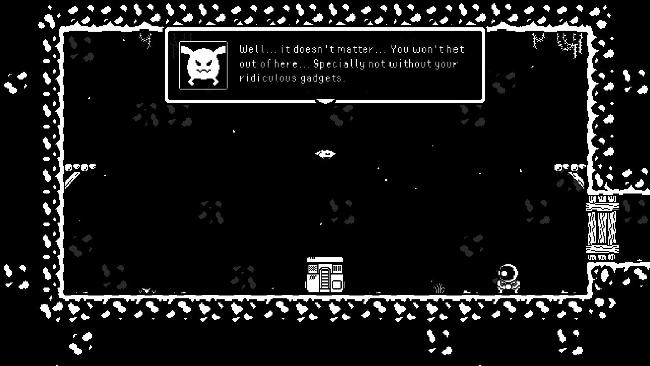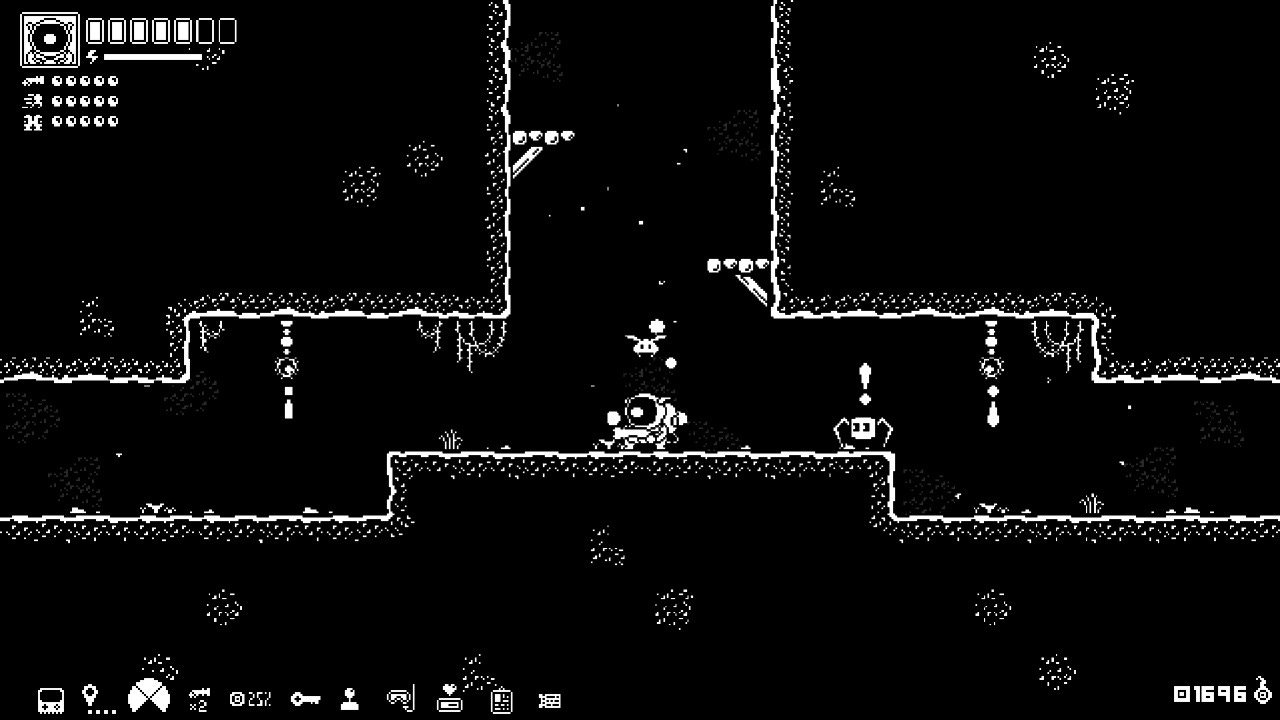 Boss fights are where the game shines brightest, demanding the use of every ability you currently possess while you learn patterns and dodge for your life. Overcommitting likely means death, but you can only survive a bullet hell for so long before you get dragged into the depths and have to start fresh again. Critically, each boss feels distinct and well-crafted for the Astronite’s current moveset. Boss-as-skill-check is a staple of Metroid-likes, and this title gets high marks in that category. But: once the screen starts getting littered with visual stimuli during these fights, all of it black and white over additional layers of the same, it becomes hard to identify even a fraction of the threats to your life. Once again the limited color palette and general lack of textures unintentionally creates big challenges for the player, making the final boss fight in particular feel downright cheap.