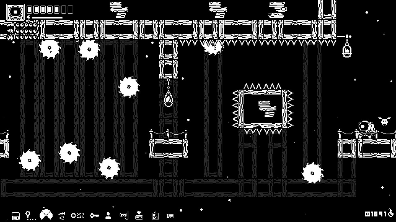 In the art department the bichrome color palette looks fresh and clean, and the developers wrung a surprising amount of variety out of such simple tools. Of course, a limited palette and set of textures is bound to create some issues with visibility. At times it was difficult to identify what was and was not going to deplete one of my precious few health bars. I couldn’t help but get frustrated when a solid white stalactite suddenly opened one eye and started lobbing projectiles at me — is it a bug or a feature that none of these things pop from the background art? Either way, it’s annoying “gotcha” game design that happened altogether too often.
