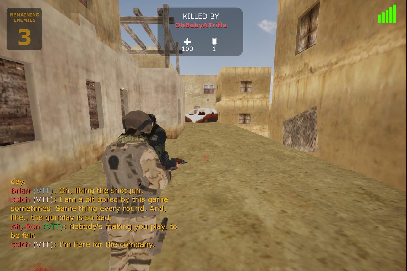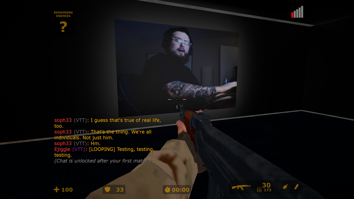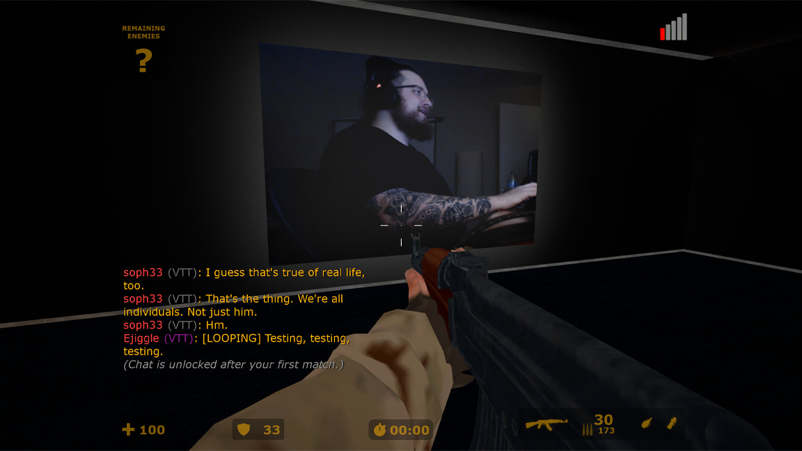The game is presented as a bare-bones multiplayer shooter, its visuals straight out of 1998. Crude textures and simple polygons make for a nostalgic glimpse into the past, and a choice between three basic loadouts — rifle, sniper, or shotgun — serve to remind how far the genre has come. Loading into a match under the pretense that this was in fact an online shooter, I was prepared to get a little sweaty and kill some bad guys. Instead, I was met with the voice comms of a group of European strangers, lamenting that the rando didn’t have a mic. It immediately became clear this was going to be a bit of interactive theater, and I shifted expectations accordingly: the disjointed gunplay melted away and I was along for the ride as the group prattled on about their favorite crisps.