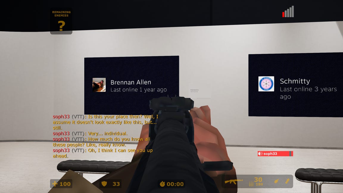 The choice to use a fully-playable fictional FPS as the medium for a narrative experience presents a clear challenge: guide the player through the story to preserve its intended pacing, timing, and impact but also sell the illusion that this is a real video game. It’s a tough line to tread. It’s walked relatively well here, but there was a decent amount of standing around and aimlessly shooting — especially in one particular room, where post-it-notes slowly spawned on the walls one at a time. I must have looked over and shot damn near everything in there five times before realizing the post-its were multiplying, a moment emblematic of the tension between yielding control to the player and steering them through the narrative. I also had a full crash that at first I figured this was an intentional part of the experience. After logging back in and resuming play elicited no comments from the other “players” on the matter, though, it was clear that wasn’t the case — just a regular old crash that broke the flow of a story I was otherwise engrossed in. - Chris