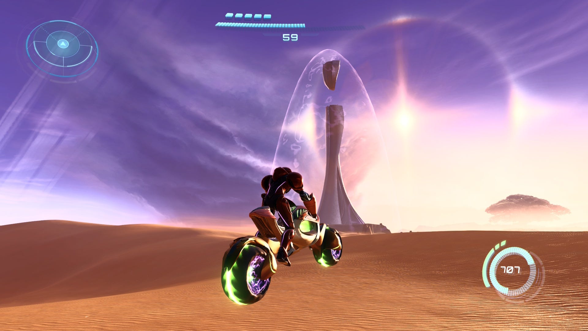 Here’s the big one, though: the map and level designs are just straight up not Metroid at all. What’s there is pretty to look at and scored beautifully but the maps don’t connect with one another, and offer zero shortcuts to discover down the line. Each zone is a series of mostly linear pathways that involve progressing further with the ability acquired in that zone. Return trips almost always involve opening doors using elemental weapons called “shot” that take the place of traditional beam swapping or stacking. At the heart of it all is the expansive Sol Valley. No major story events happen out there, no required abilities are hidden in the shrines, just green crystals as far as the eye can see. Motorcycle joyriding aside, there just isn’t enough here to justify tearing out a design philosophy that is used in literally every game in the series, hell — the entire genre!